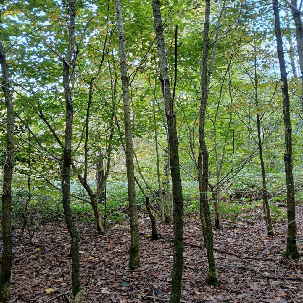 Dans ce cas, trois options se présentent : l’arbre au premier plan, l’arbre à l’arrière-plan à gauche et l’arbre à l’arrière-plan à droite. Les autres arbres sont clairement moins vigoureux et présentent des courbures du tronc. Remarquons également la présence de noisetiers à l’arrière-plan, utilisés comme essence accompagnatrice. Pour les chênes sessiles en particulier, comme ici, il est important de disposer d’espèces d’arbres ou d’arbustes accompagnatrices. Celles-ci enveloppent en quelque sorte le tronc et empêchent la formation d’épicormiques[6] sur le tronc de l’arbre-objectif choisi.