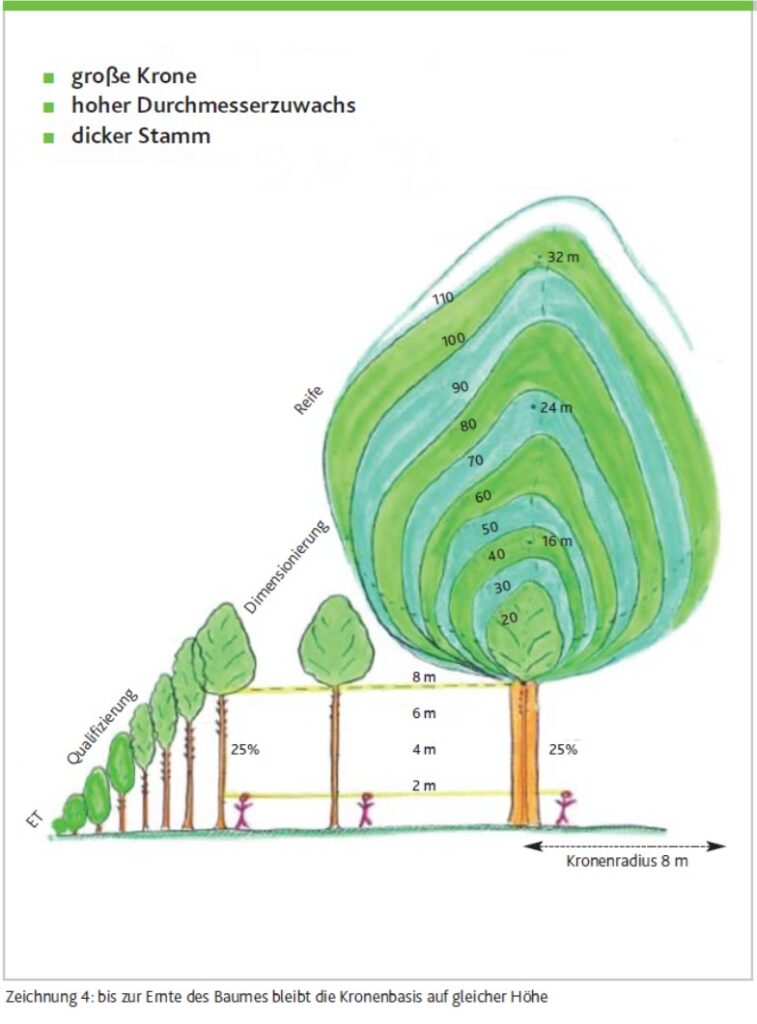 Il est essentiel que la base de la couronne reste à la même hauteur, ici à 8 mètres. On y parvient en libérant systématiquement et complètement la couronne de l’arbre-objectif lors des éclaircies successives. De cette manière, la couronne – véritable moteur de la croissance – continue à assurer une photosynthèse maximale, aucune branche morte ne se forme sur le tronc, ce qui pourrait nuire à la qualité du bois et des largeurs de cernes régulières de 0,5 à 0,7 cm sont parfaitement réalisables (soit une croissance en circonférence de 3 à 4 cm par an).